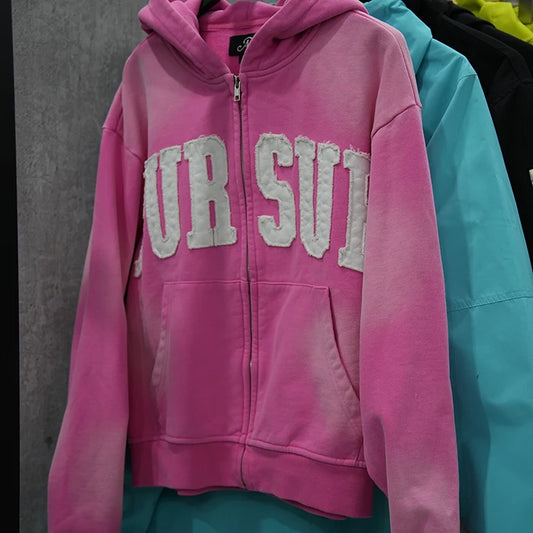 100% Cotton Heavyweight Hoodie Men Custom Applique Patched Oversized Men Sun Faded Washed Zip Up Hoodie