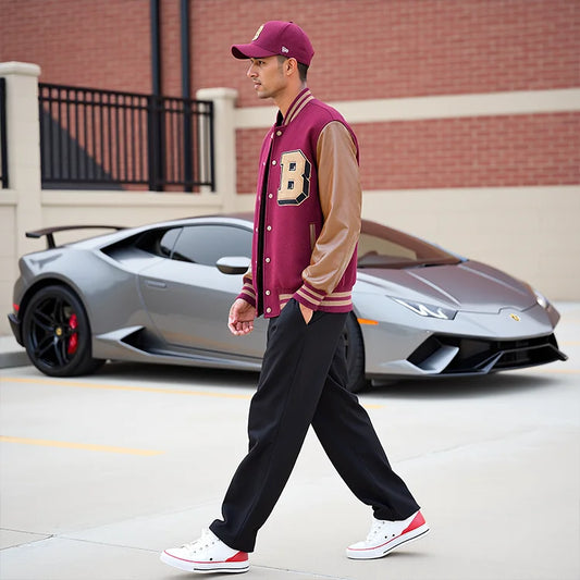 Brown PU Sleeve Patchwork Maroon Letterman Jacket Men Simple Monogrammed Embroidered Varsity Jacket Custom