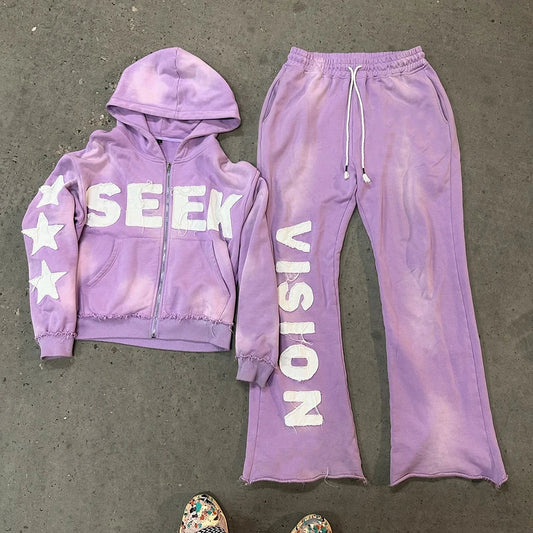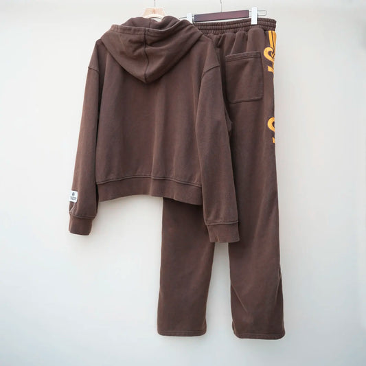 Oem Wholesale Unisex Tracksuit Streetwear Vintage Washed Two Piece Zip Up Sweatshirt Hoodie Flared Sweatpants Set