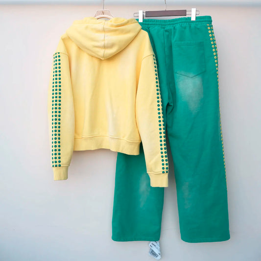 Factory Customized Vintage Washed Sunfaded Mens Tracksuit Sweatsuits Oem Rhinestone Two Piece Sweatpants Hoodie Sets