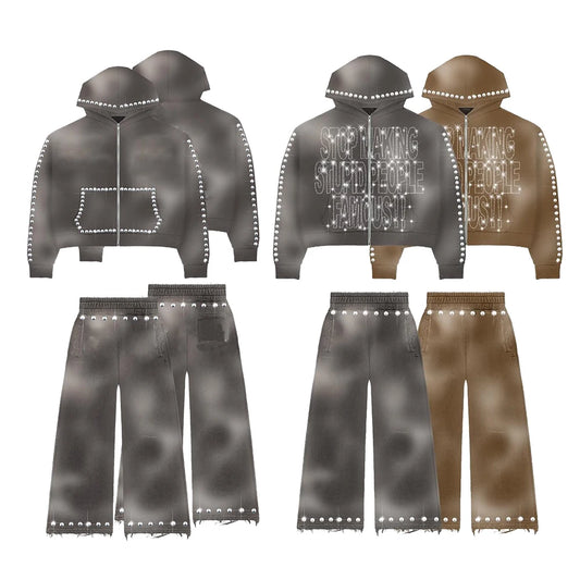 Oem Streetwear Mens Blank Tracksuit Set Custom Logo Printing Men Vintage Sunfaded Washed Rhinestone Sweatpants Hoodie Sets