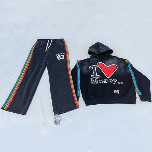 Vintage Washed Unisex Oversized Tracksuits Sets Custom Logo Printed Striped Trimmed Men Graffiti Hoodie Sweatpants Sets