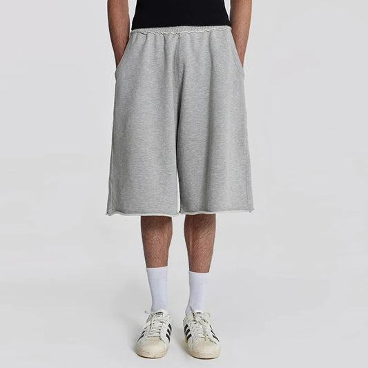 HuiLin Hochwertige, maßgeschneiderte, übergroße Turnshorts für Herren, mit rauem Saum, schweres French Terry, blanke Baumwoll-Sweatshorts