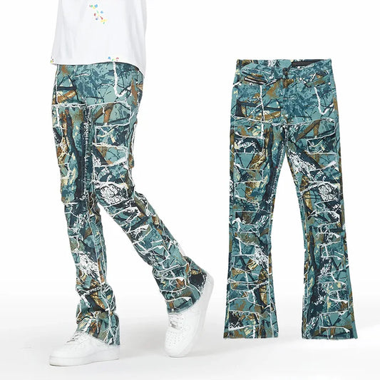 Manufacturer Multi-Patch Slim-fit Stacked Flared Pants Denim Custom Digital Printing Camouflage Jeans Men's Pants