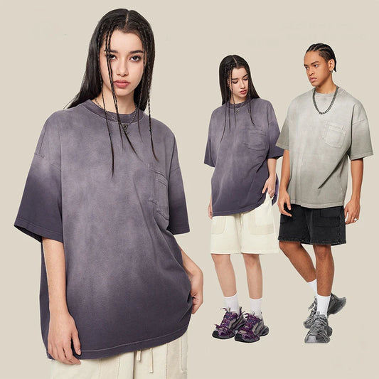 Huili Hersteller Sommer 285G 100% Baumwolle Säure gewaschen allmählich übergroßen Rand Kurzarm Vintage T-Shirt für Männer