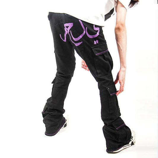 HL Hersteller Großhandel schwarze gestapelte Hosen benutzerdefinierte Druck Multi Taschen Carpenter Nylon Cargohose OEM Herren Flare Cargohose