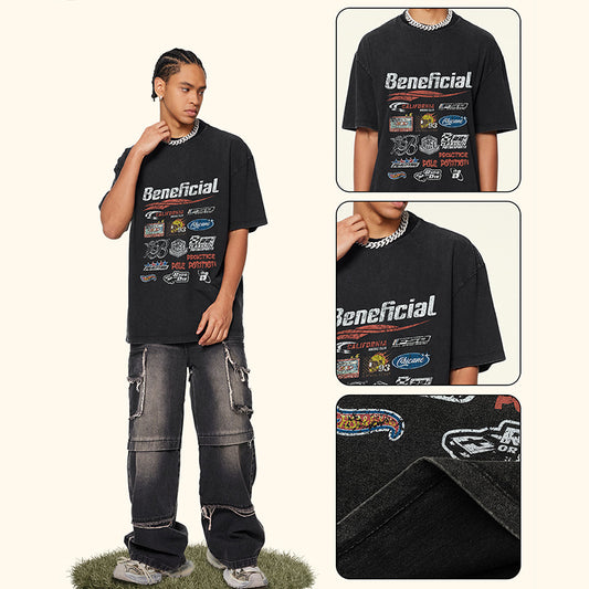 Men's washed distressed Oversized racing logo dark trendy brand short-sleeved T-shirt