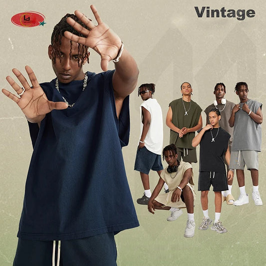 Huilin Fabrik, neues Design, 100 % Baumwolle, abgeschnittenes Tanktop für Männer, benutzerdefiniertes, gewaschenes, übergroßes, ärmelloses T-Shirt mit offenem Saum im Vintage-Stil