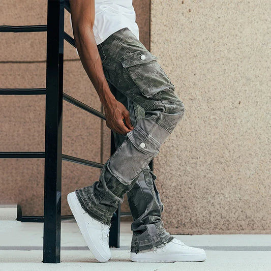 Manufacturer wholesale utility pockets stacked jeans men custom streetwear raw hem denim pants bootcut jeans flare