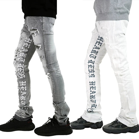 Manufacturer wholesale streetwear letter printed ripped denim jeans custom distressed jeans flare designer stacked jeans men