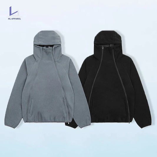 HL-Hersteller im Großhandel, neues Design, doppelter Reißverschluss, halbes Gesicht, Polarfleece, schlichter, leerer Hoodie, durchgehender Reißverschluss, Hoodie mit individuellem Reißverschluss