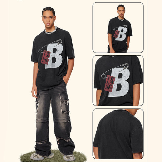 Men's high street paper clip vintage oversized heavy top pure cotton short-sleeved T-shirt for men