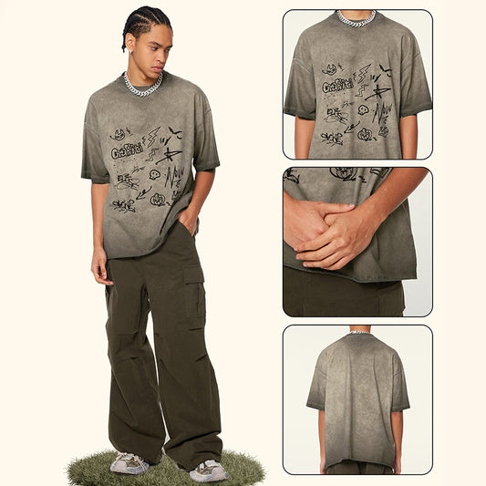 Men's graffiti printed oversized half-sleeved tops vintage short-sleeved T-shirts for men and women