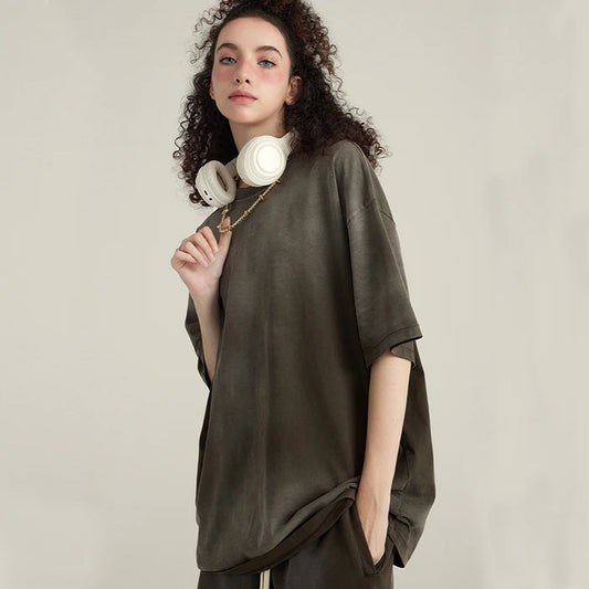 Huili OEM Custom Neuer Trend Farbverlauf Gewaschen Unisex Übergroßes Vintage T-Shirt Schnittkante Rohsaum Herren Dickes Baumwoll-T-Shirt