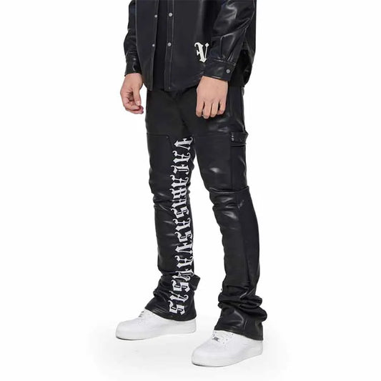 Streetwear black leather pants wholesale designer trendy heavyweight flare stacked jeans men custom letter jeans