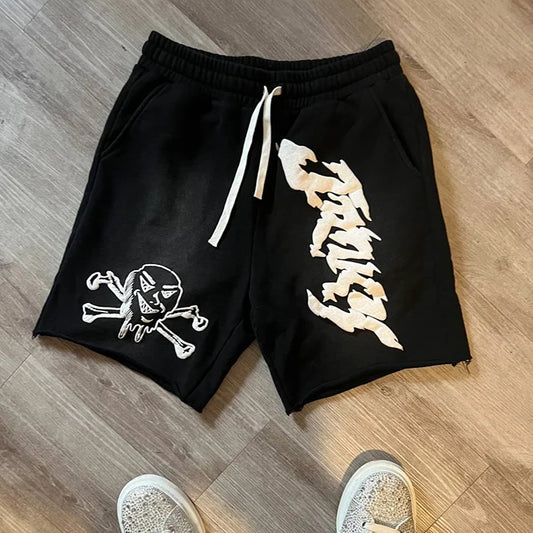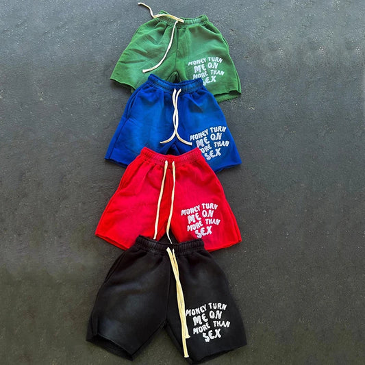 Maßgeschneiderte schwere Baumwollhose mit rohem Saum, zerrissenem Fleece, Streetwear-Shorts, Sport-Cargo-Jogginghose mit Kordelzug, Acid-Wash-Shorts