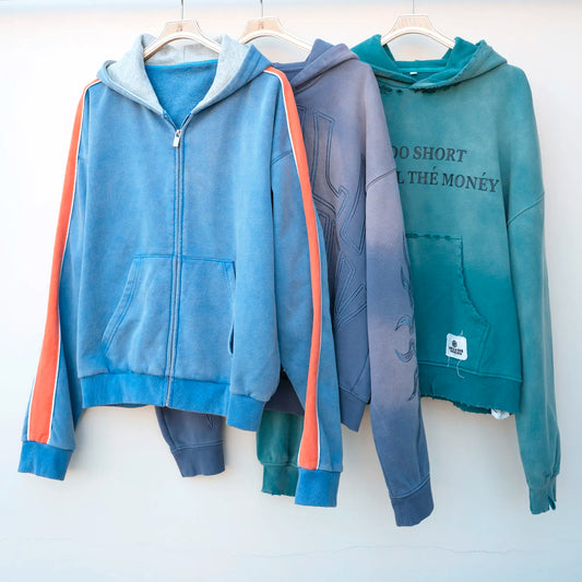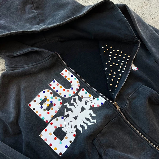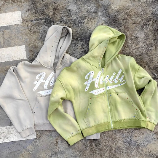 Vintage Washed Heavyweight French Terry Hoodies Oversized Fit Men Zip up Screen Printing Sunfaded Rhinestone Hoodie