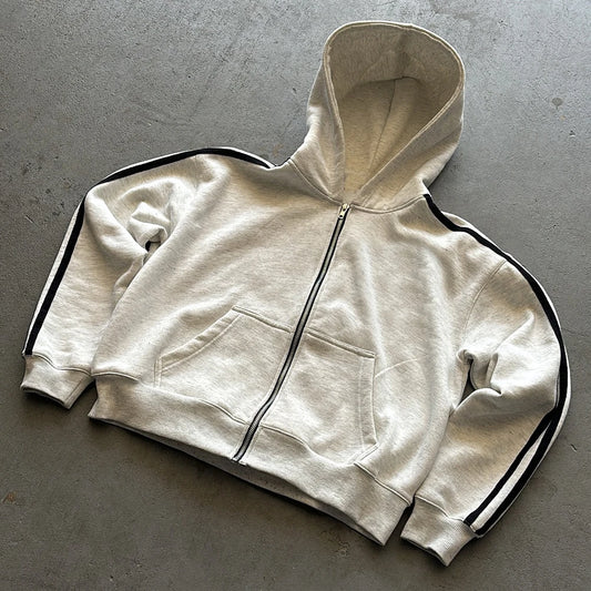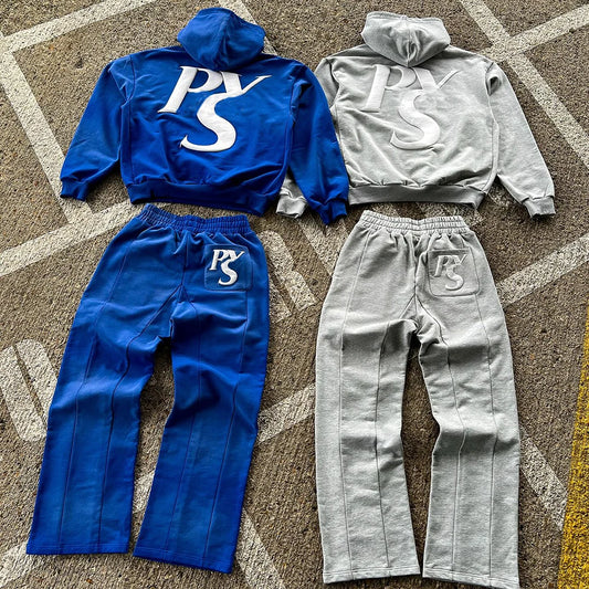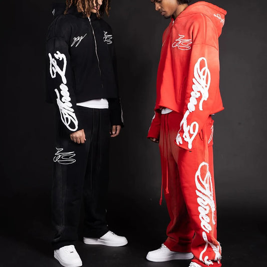 Huilin Trainingsanzug aus schwerer Baumwolle, lockere Passform, Unisex, zweiteilig, mit individuellem Logodruck, Herren-Kapuzenpullover mit Reißverschluss und weitem Bein, Jogginghosen-Set