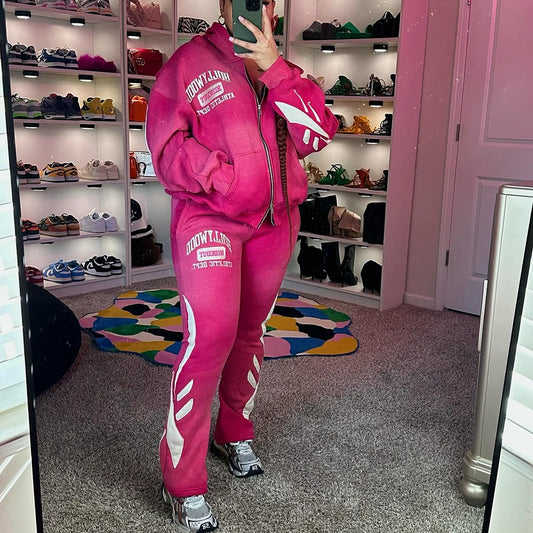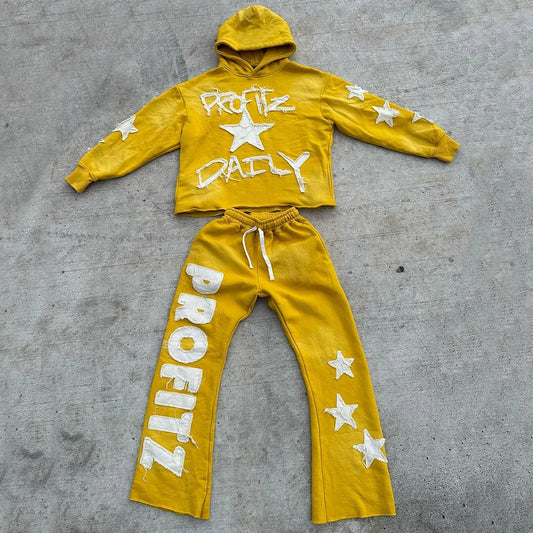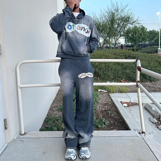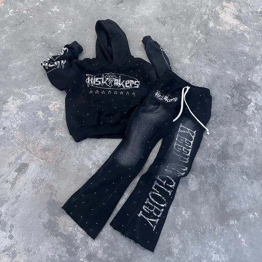 Huilin Custom 2-teiliger Streetwear-Trainingsanzug, Sweatsuits, schwere Baumwolle, Vintage, gewaschen, Herren, Strass-Kapuzenpullover, Jogginghose, Sets