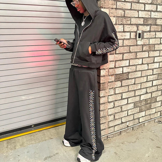 Huilin Factory Großhandel Übergroße Jogginghose mit weitem Bein Hoodies Sets Männer Benutzerdefinierte Strass Seite Zweiteiliger Streetwear Trainingsanzug