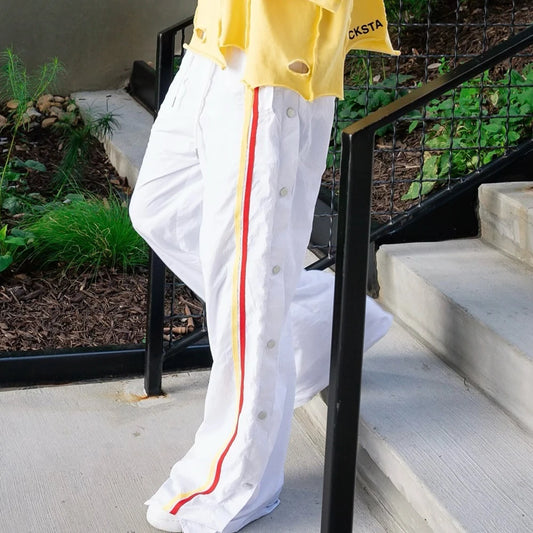 Huilin Hersteller OEM Unisex Nylonhose mit elastischem Bund Individuell gestreifte Trainingshose für Herren mit Druckknopf an der Seite und weitem Bein