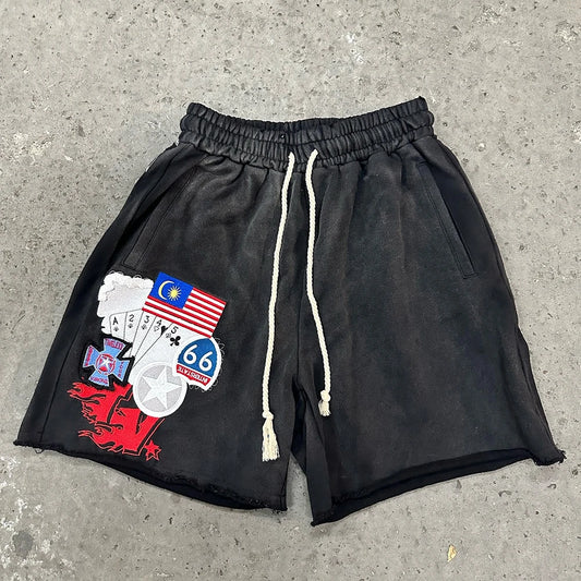 Huilin Hersteller Sunfaded Acid Vintage Washed Dicke Baumwollshorts Herren Benutzerdefinierte Logo-Stickerei Patched Raw Hem Sweat Shorts