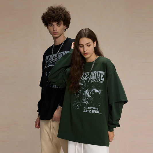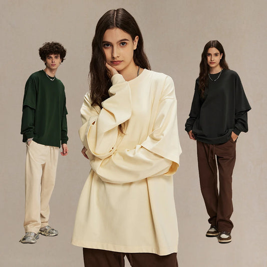 Streetwear Unisex Loose Fit Tshirts Custom Screen Printing Men 305Gsm Heavwyeight Cotton Double Layer Long Sleeve T Shirt