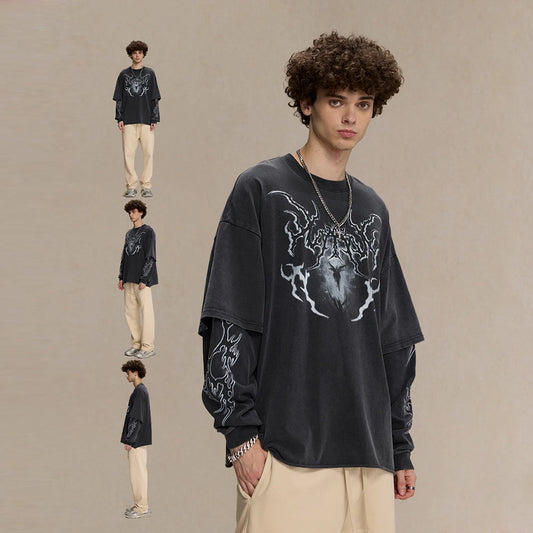 345Gsm Heavyweight Retro Vintage Washed Tshirts Custom Screen Printing Men Oversized Double Layer Long Sleeve T Shirt