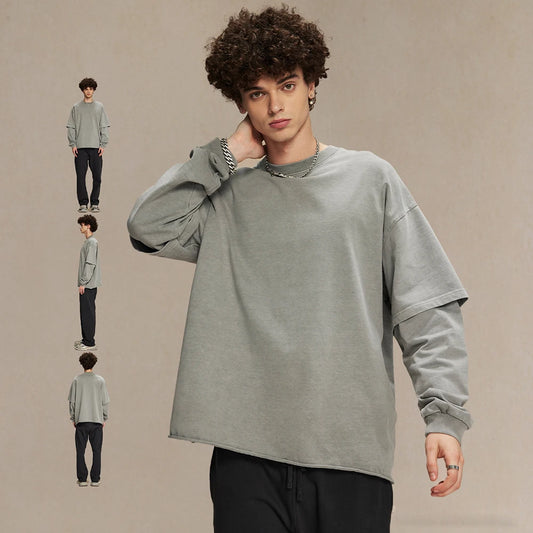 Oem Unisex Vintage Washed Thick Cotton Blank Tshirts Custom Oversized Fit Men Raw Hem Double Layer Long Sleeve T Shirt